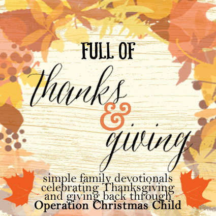 I volunteered throughout college with Operation Christmas Child and love their mission.  Our family has loved packing boxes for children across the globe, and this devotional series connects the heart behind giving with the practical tips for completing a shoebox.  My prayer is that your family would be blessed and know more of the heart of God as you explore the devotionals and learn about THANKS and GIVING.